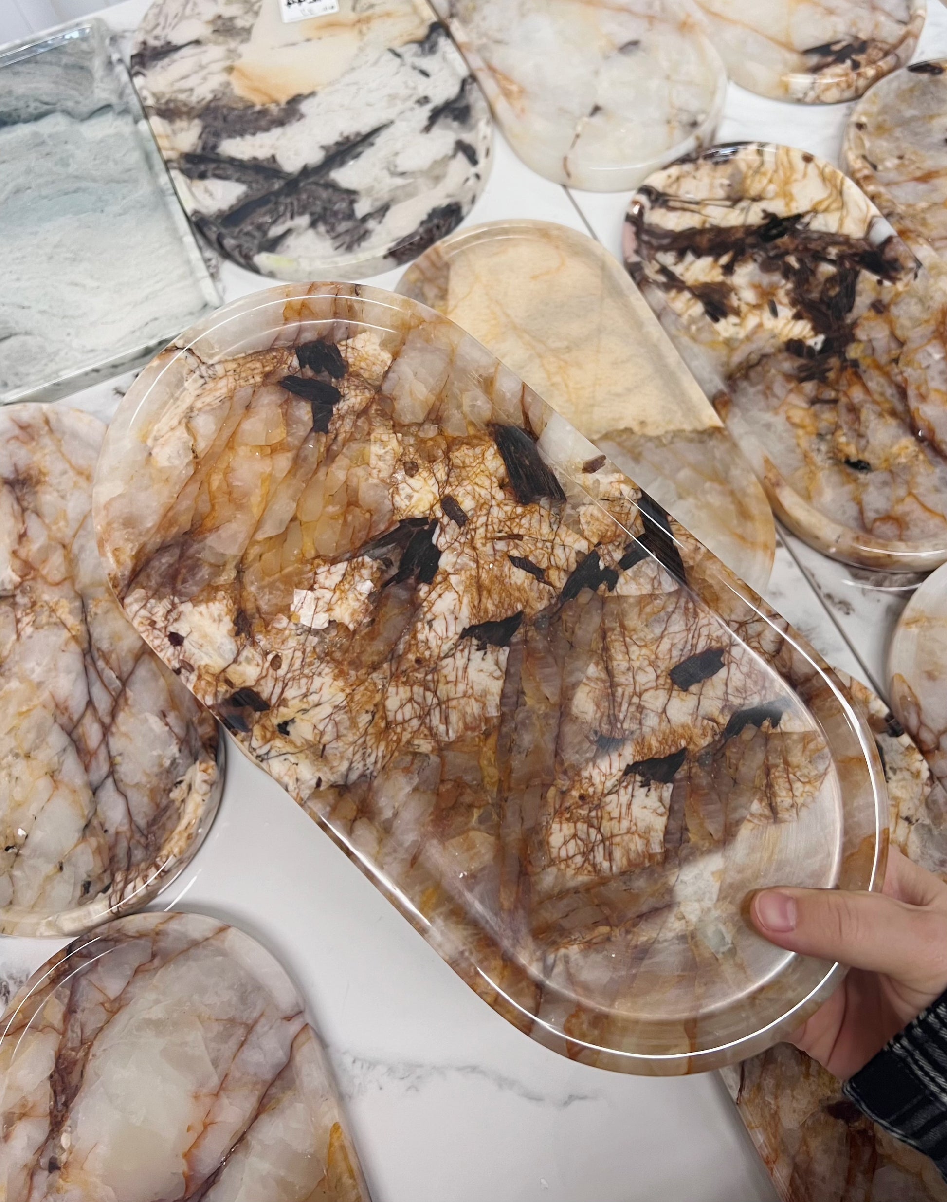 Each tray is one-of-a-kind, crafted from real marble, ensuring a distinct look. Due to the nature of naturally grown stones, the patterns vary, making every piece unique. Available in two sizes, our marble trays cater to all your daily needs. Elevate your space with the timeless beauty of our Gold Pandora Marble Tray.